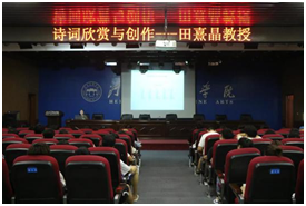 2019年6月11日,田熹晶教授应邀莅临我院,在正成国际报告厅展开题为“诗词欣赏与创作”的专题讲座,书法学院常务副院长候冬菊主持讲座,我院师生参加。