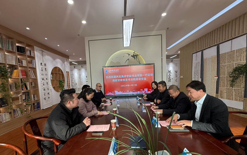 为积极响应教育部关于高校书记校长座谈交流及访企拓岗促就业专项行动号召,进一步加强校校合作,拓宽学生就业渠道,提升人才培养质量,2026年1月8日,河北美术学院书法学院常务副院长侯东菊,副院长郭云鹏,系主任张奎元,书法学院教师成欢、牛拓一一行前往兰州城市学院甘肃张芝书法院开展座谈交流及访企拓岗专项活动。