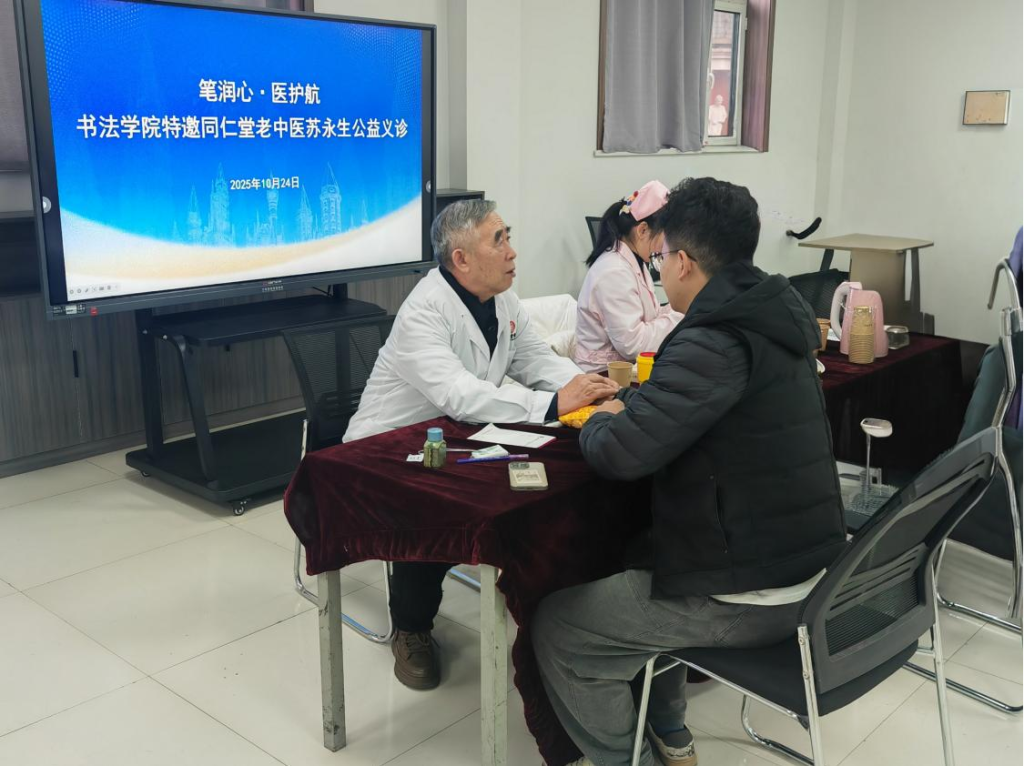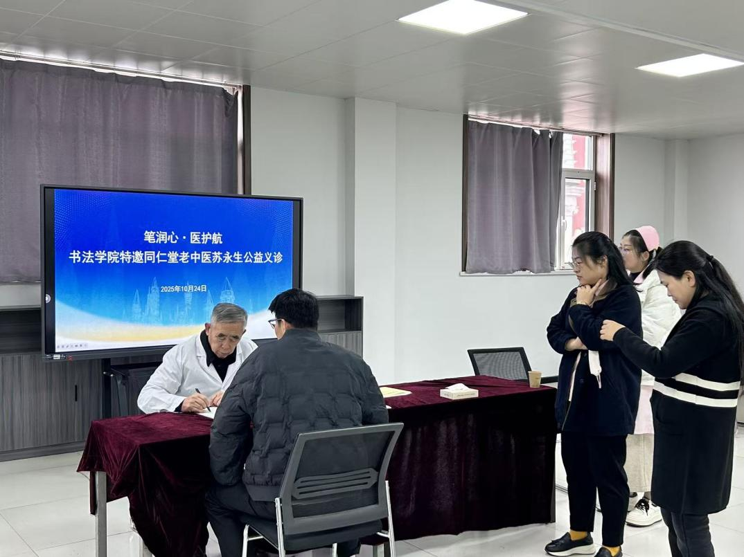 为关爱教职工身心健康,传递学院人文关怀,2025年10月24日,书法学院在2号教学楼805室成功举办“笔润心·医护航”同仁堂老中医公益义诊活动。本次活动特邀“同仁堂”老中医苏永生,为辛勤耕耘在教学、管理一线的教职工们提供了一场专业、贴心的健康服务。